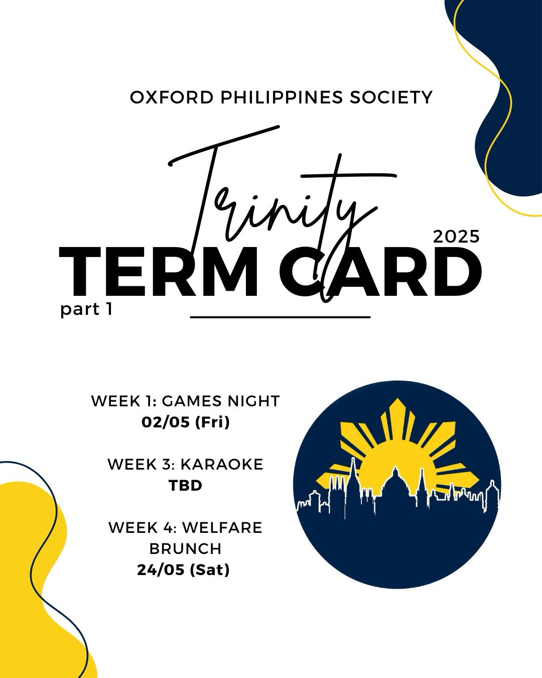 Our Events Each term, the Oxford Philippines Society hosts a wide range of events to cater to both academic and social interests of our members. Follow us on Instagram and join the WhatsApp Community to stay updated on these events. View our Termcard
